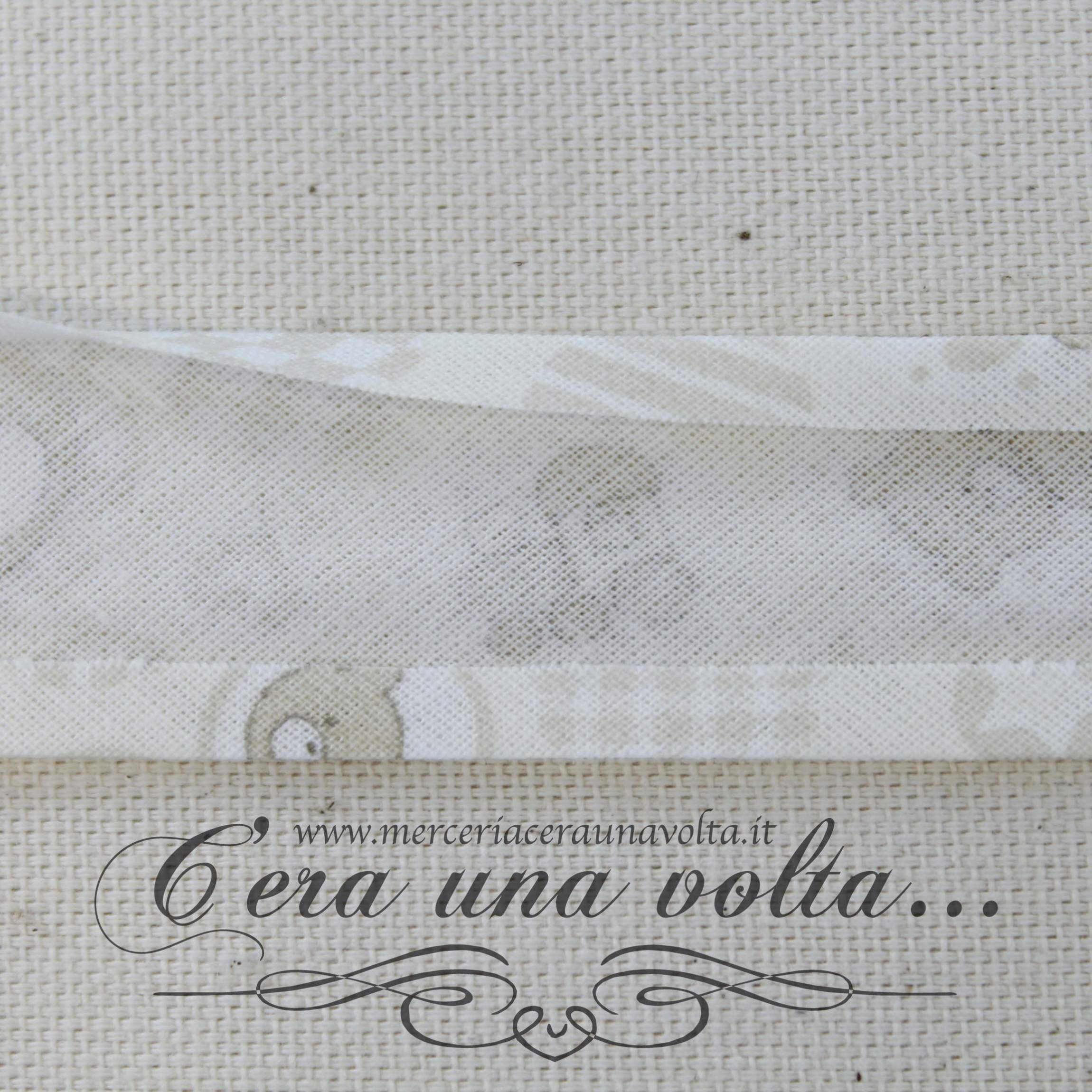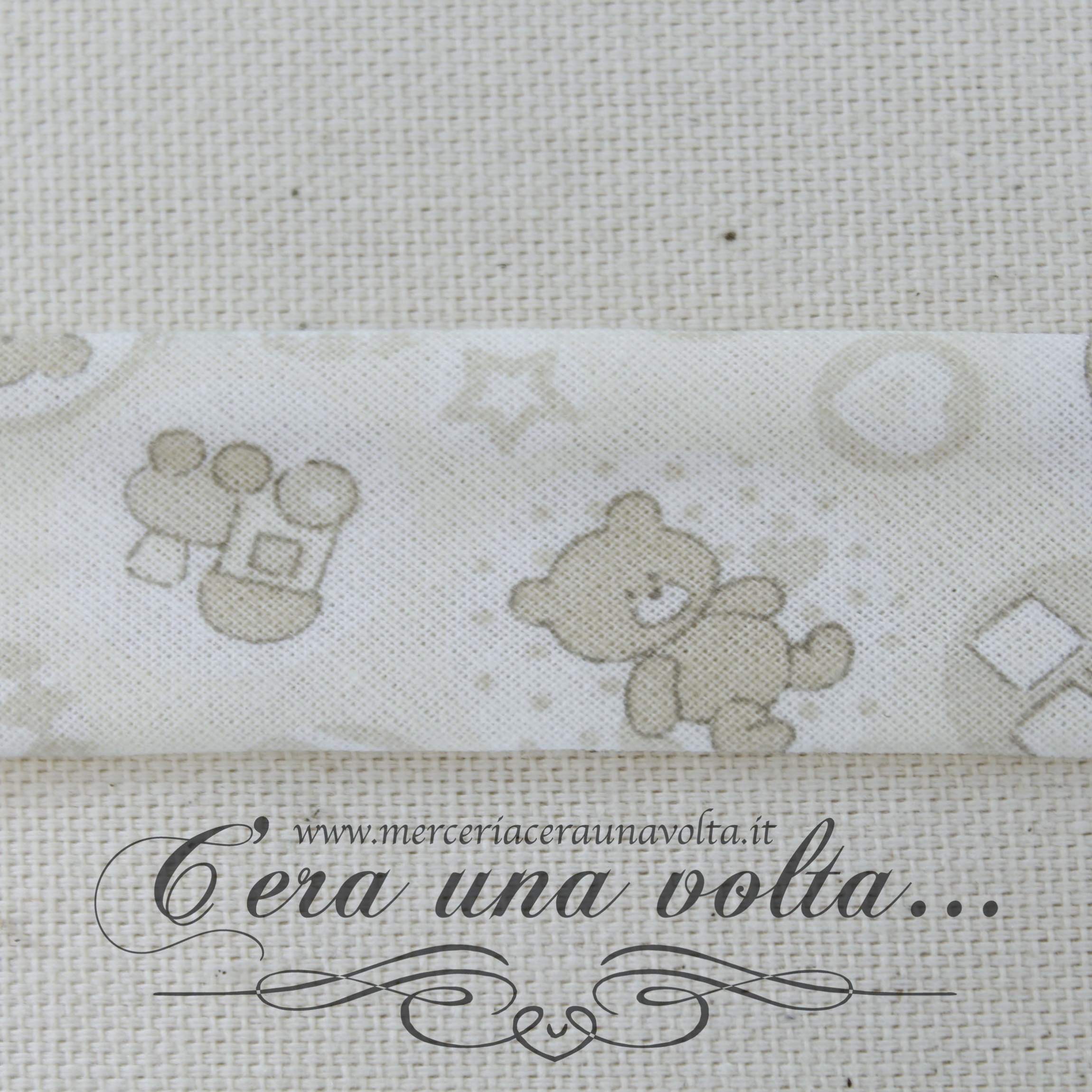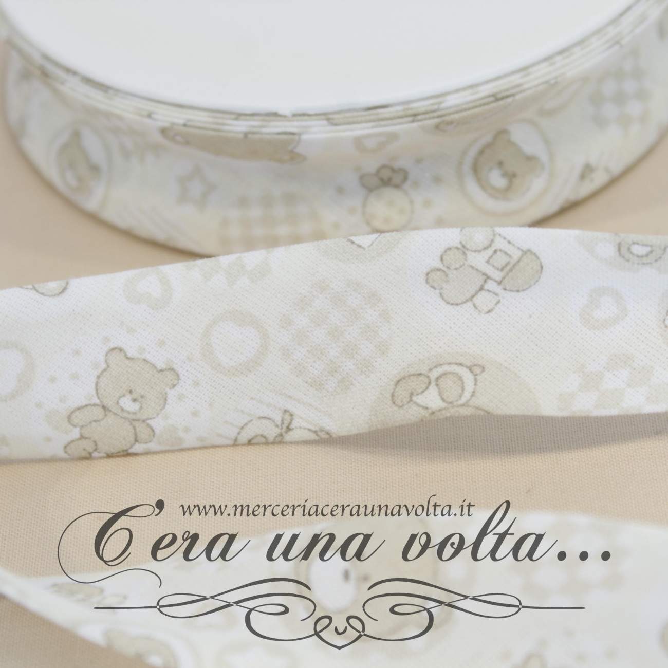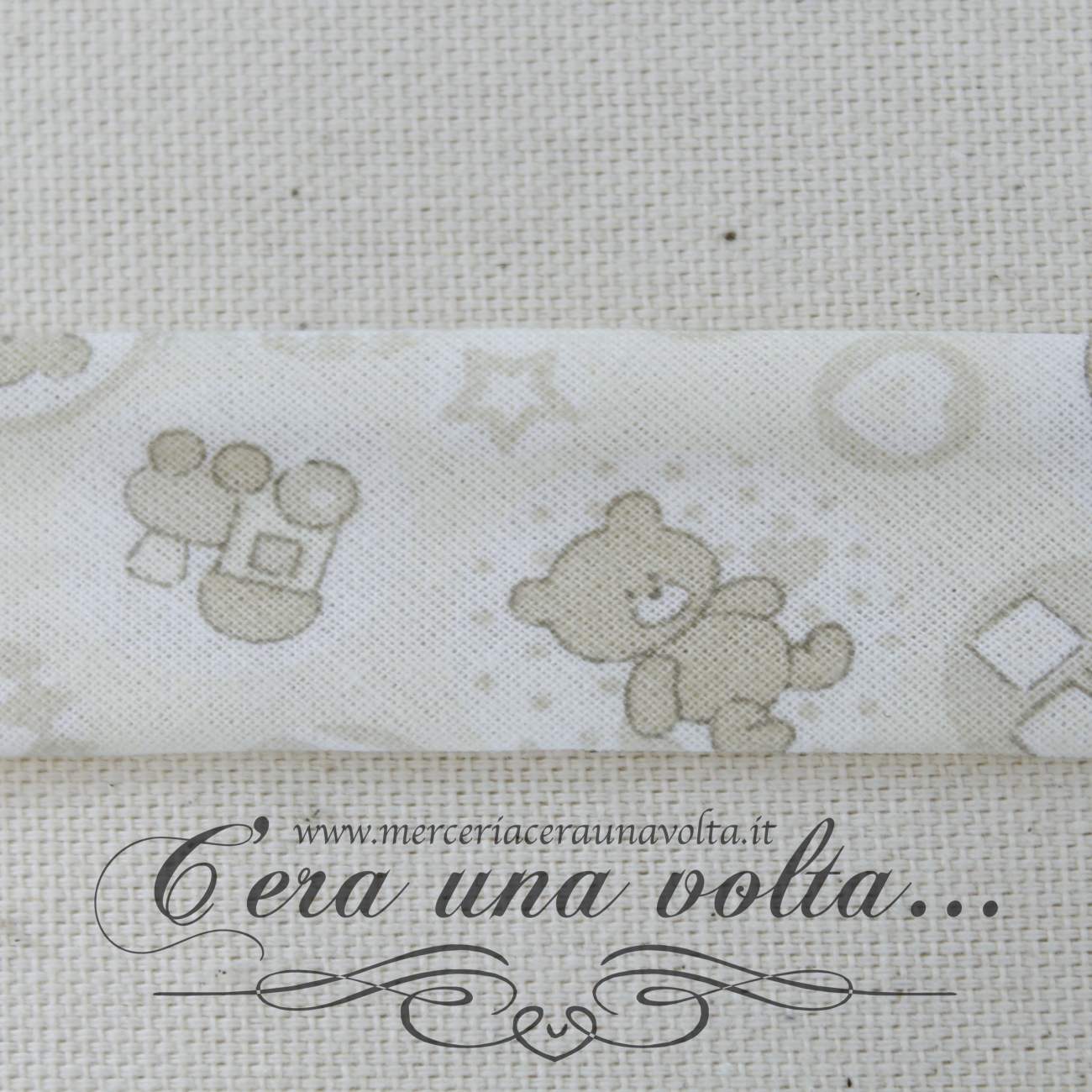 Sbieco di cotone di qualità superiore, con stampa di orsetti e stelline. Questa bordura ha il pregio di adeguarsi, a forme non lineari ( curve ), come scollature, giro manica, bordi arrotondati. Serve a rifinire orli, mascherare risvolti, coprire sfilacciamenti, i margini sono ripiegati all'interno di cm 0,50 da ambo i lati